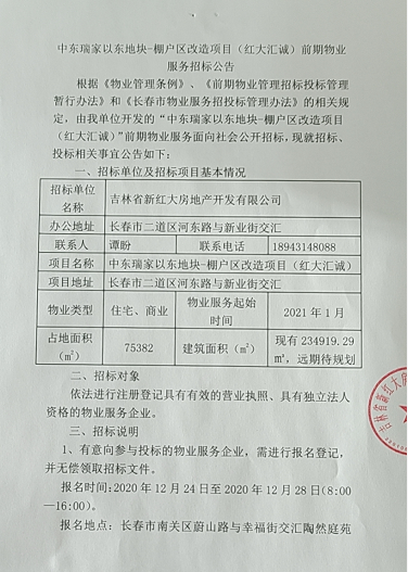 中东瑞家以东地块棚户区改造项目(红大汇诚)前期物业服务招标公告