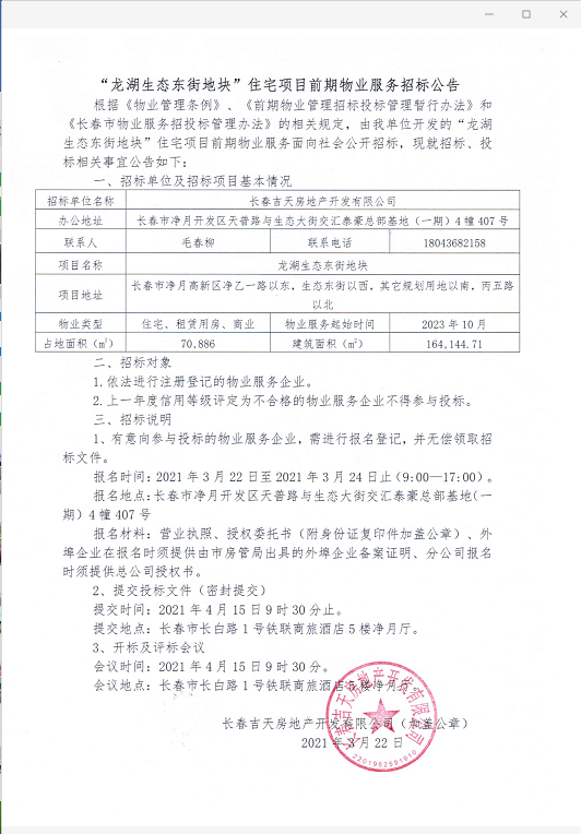 龙湖生态东街地块住宅项目前期物业服务招标公告