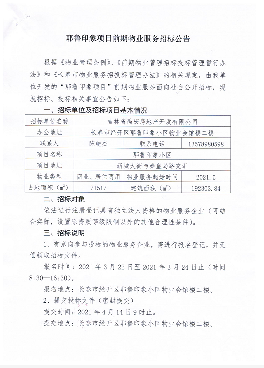 耶鲁印象项目前期物业服务招标公告