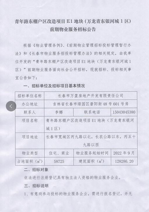 青年路东棚户区改造项目E1地块万龙青东银河城1区前期物业服务招标公告