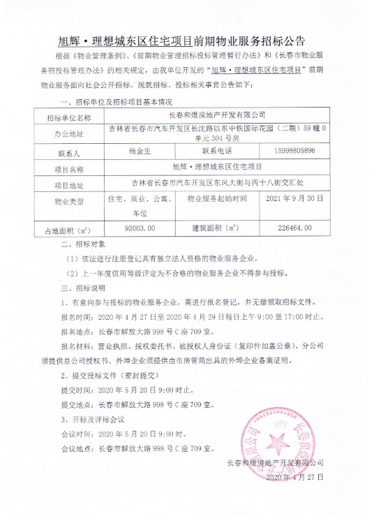 旭辉理想城东区住宅项目前期物业服务招标公告