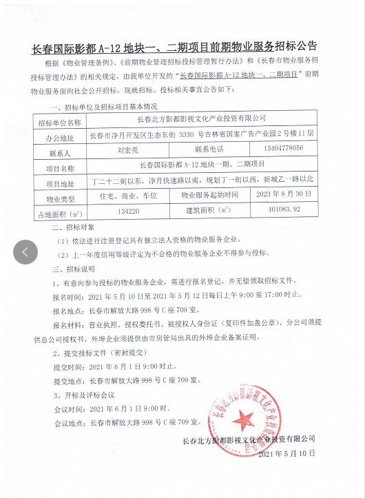 长春国际影都A-12地块一、二期项目前期物业服务招标公告