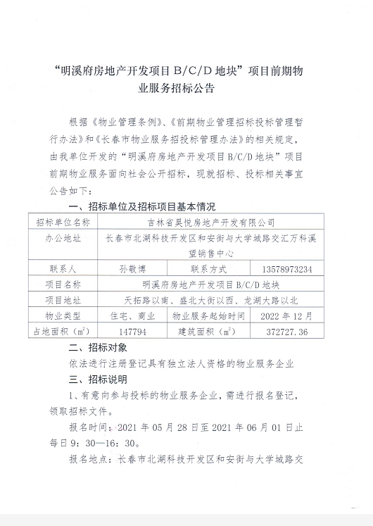 明溪府房地产开发项目B/C/D地块项目前期物业服务招标公告