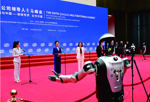 6月19日,一台人形机器人在第六届跨国公司领导人青岛峰会嘉宾通道上提问。当日,由山东省政府和商务部共同主办的第六届跨国公司领导人青岛峰会在山东青岛开幕,来自43个国家和地区的570位嘉宾齐聚峰会。本届峰会的主题是“跨国公司与中国——链接世界,合作共赢”,为跨国公司搭建政策对话、产业对接、项目合作的交流平台。 新华社图