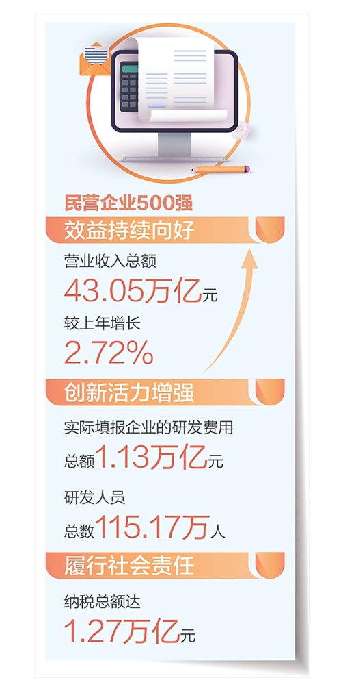 面对外部压力加大、内部困难增多的复杂严峻形势,民营企业500强坚定不移走高质量发展之路,专心致志做强做优做大企业,整体保持稳中有进、稳中向好的态势,企业效益和核心竞争力进一步增强。